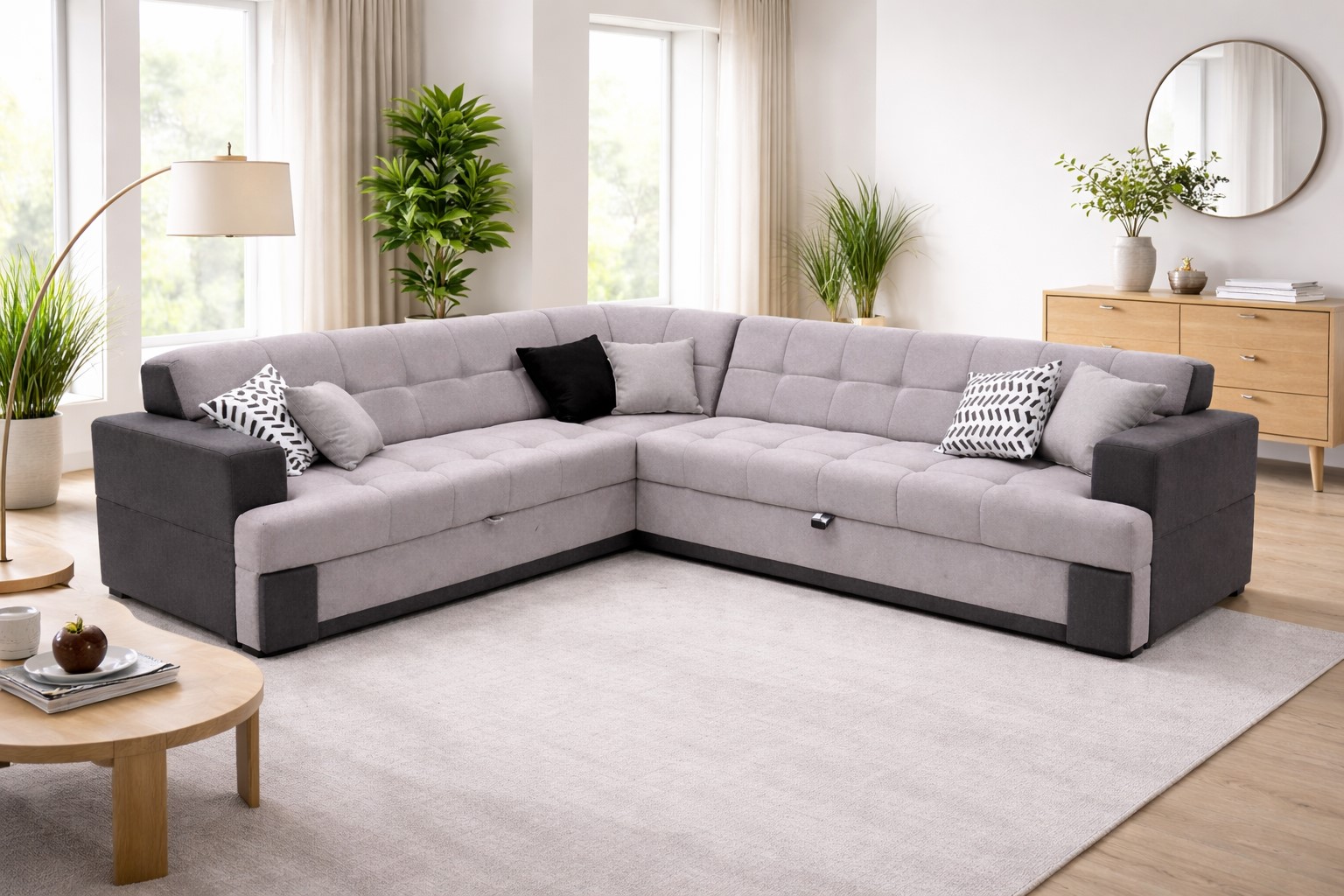 Ugaona garnitura DALI dizajnirana je za one koji žele više prostora, više udobnosti i upečatljiv izgled u svom dnevnom boravku. Presvučena kvalitetnim mebl štofom u modernim nijansama ORION 119 i ORION 118, garnitura odiše elegancijom i lako se uklapa u različite stilove enterijera. Dimenzije 295 x 295 x 90 cm čine ovu ugaonu garnituru savršenim centralnim elementom prostranog dnevnog boravka, pružajući dovoljno mjesta za odmor, relaksaciju i druženje.