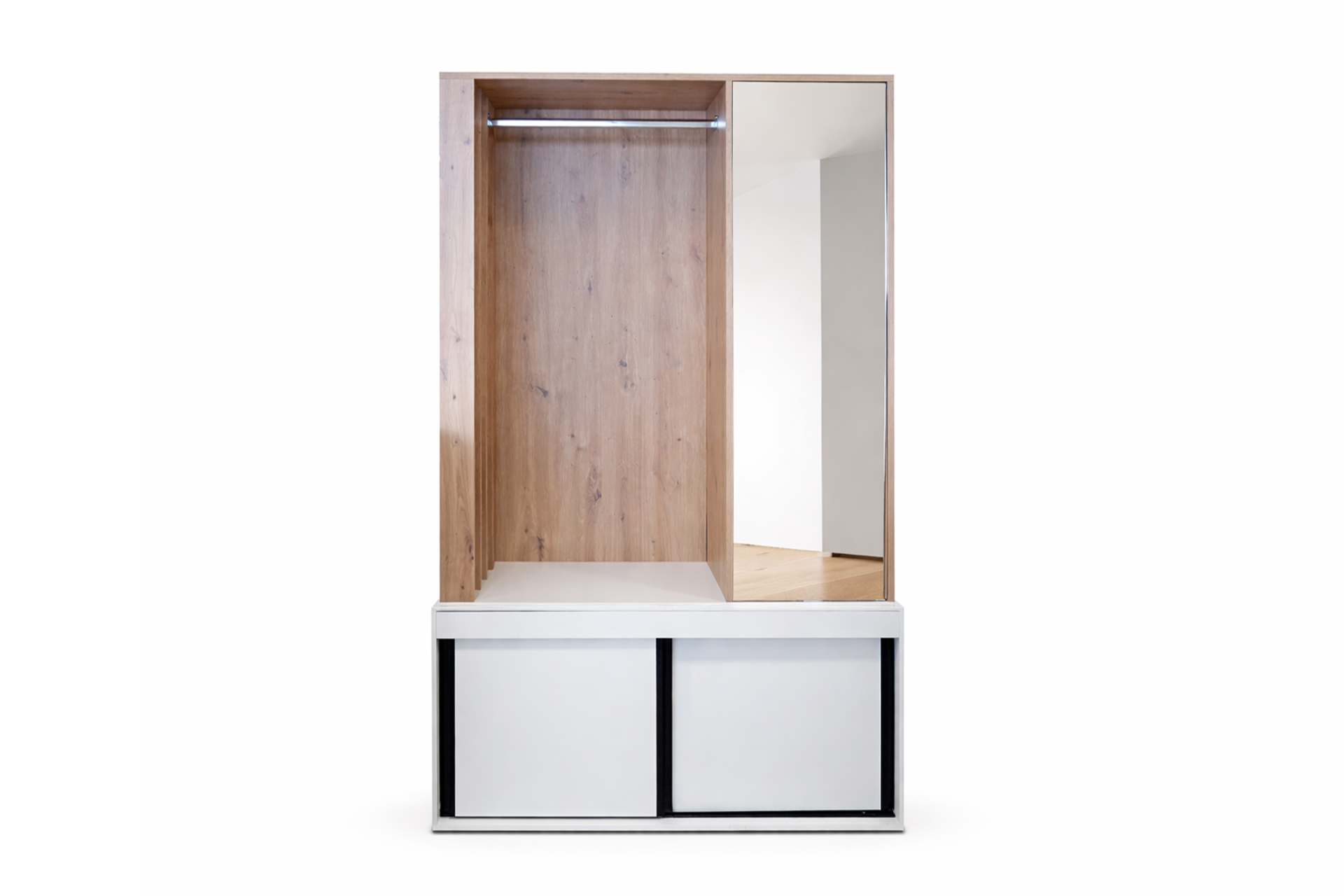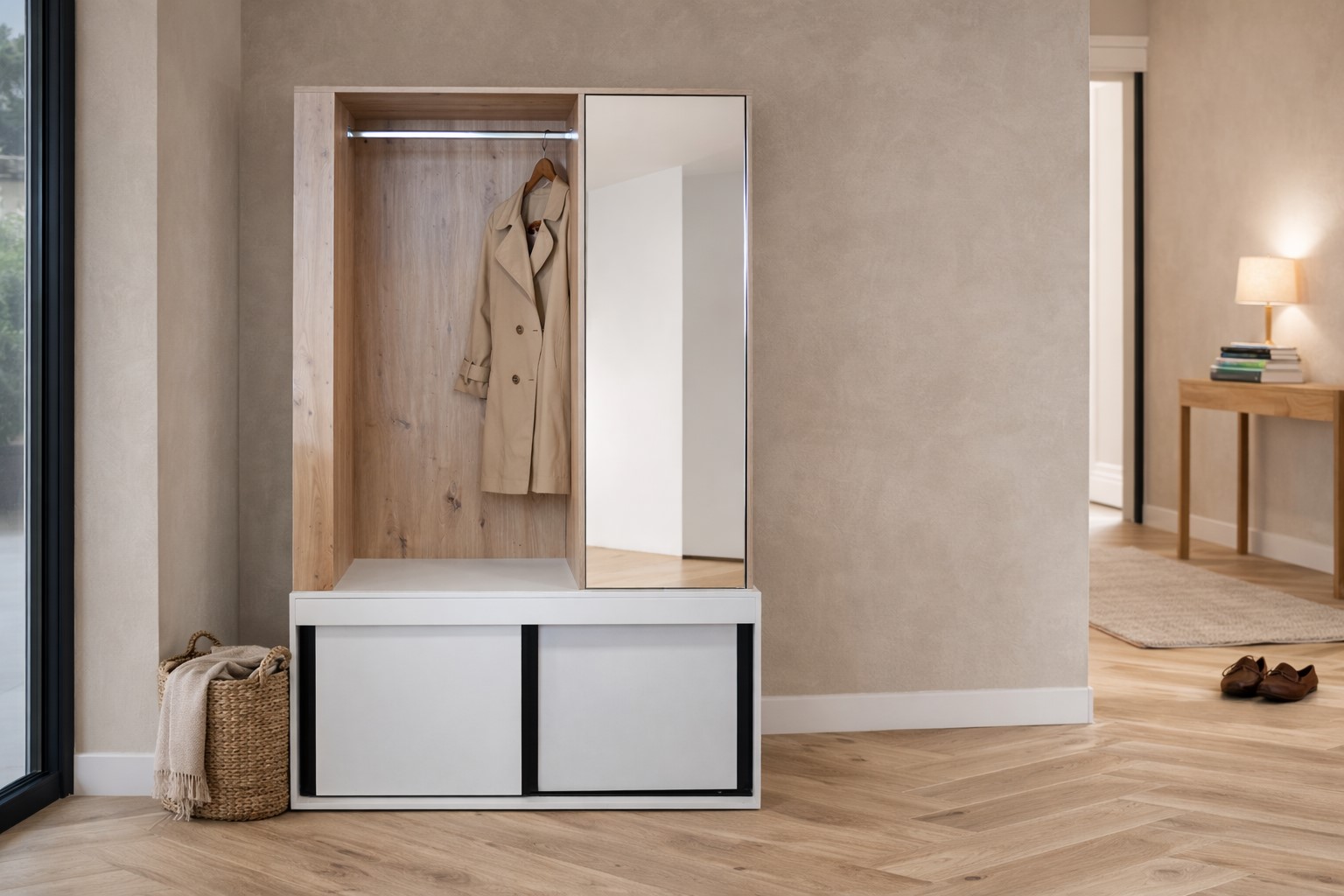 Unesite dozu modernog stila i praktičnosti uz svoj dom uz predsoblje Elegance. Izrađeno od kvalitetnog 16 mm iverala, ovo predsoblje spaja izdržljivost s elegantnim dizajnom. Kombinacija toplog dekora divljeg hrasta i čiste bijele boje pruža harmoničan kontrast koji se lako uklapa u različite interijere. Sastoji se od funkcionalnih elemenata poput ormara za obuću, vješalica, ogledala što omogućuje organiziran i estetski uređen ulazni prostor. Površine su lake za održavanje, a dizajn je osmišljen tako da štedi prostor, idealan za stanove i kuće svih veličina
