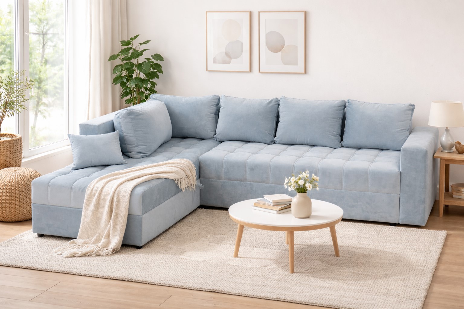 Ugaona garnitura Ema modernog dizajna izrađena je od izdržljivog mebl štofa u boji Velour 16 Silver, koji prostoru daje elegantan izgled. Garnitura je dostupna u lijevoj i desnoj varijanti, što omogućava prilagođavanje rasporedu prostorije. Sa dimenzijama 310 × 225 × 90 cm, pruža dovoljno prostora za udobno sjedenje i opuštanje.