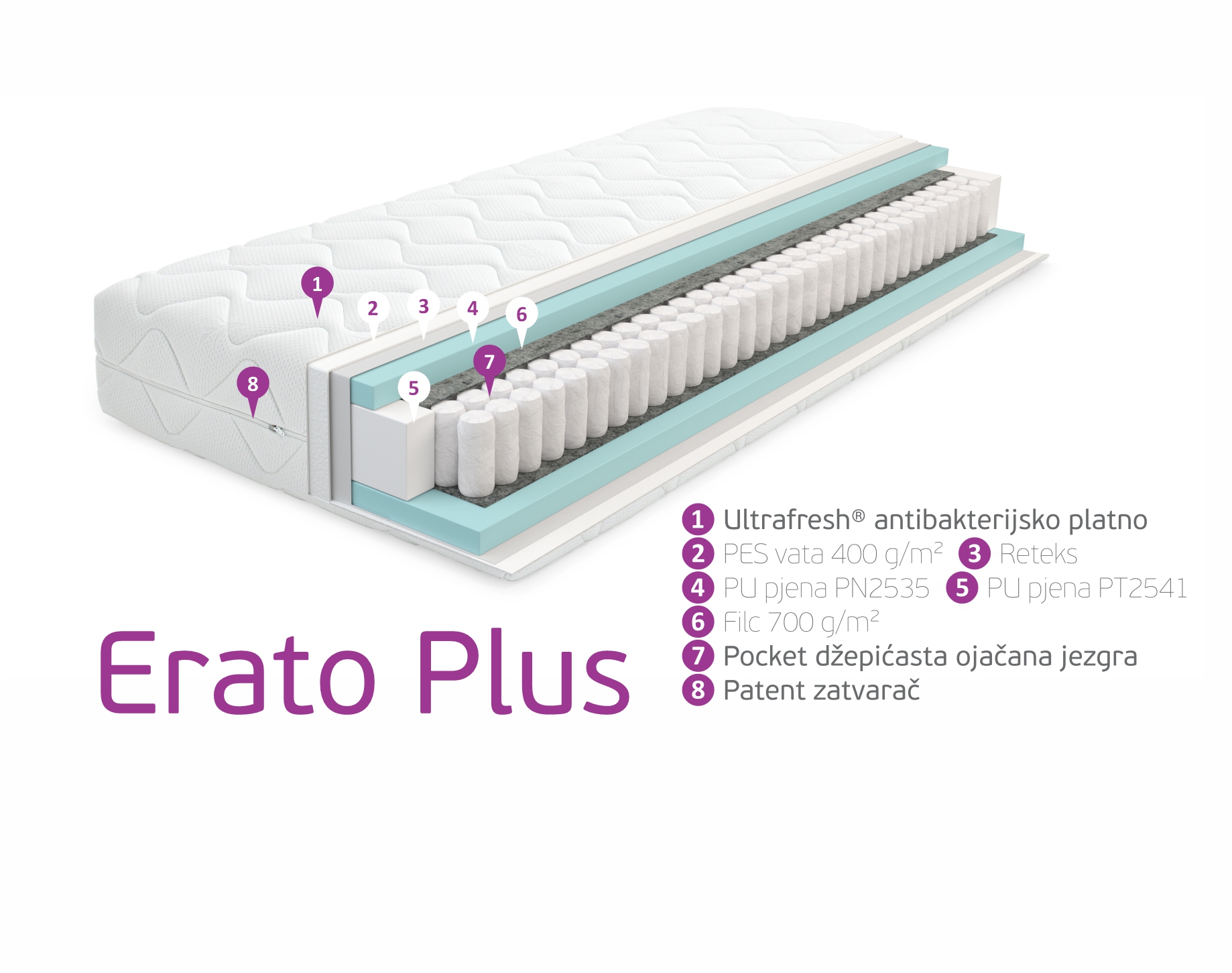 Madrac Erato Plus je kompaktni madrac sa osnovom od jezgre na bazi ojačanog džepičastog jezgra sa kvalitetnom antialergijskom i antibakterijskom navlakom koja ima patent zatvarač što omogućava njeno skidanje i pranje. Jezgro madraca zaduženo za kvalitetniju potporu tijelu je obloženo visokoelastičnom pjenom normalne tvrdoće osiguravajući tijelu spavača zadovoljavajući nivo udobnosti. Ukupne je visine cca 22 cm