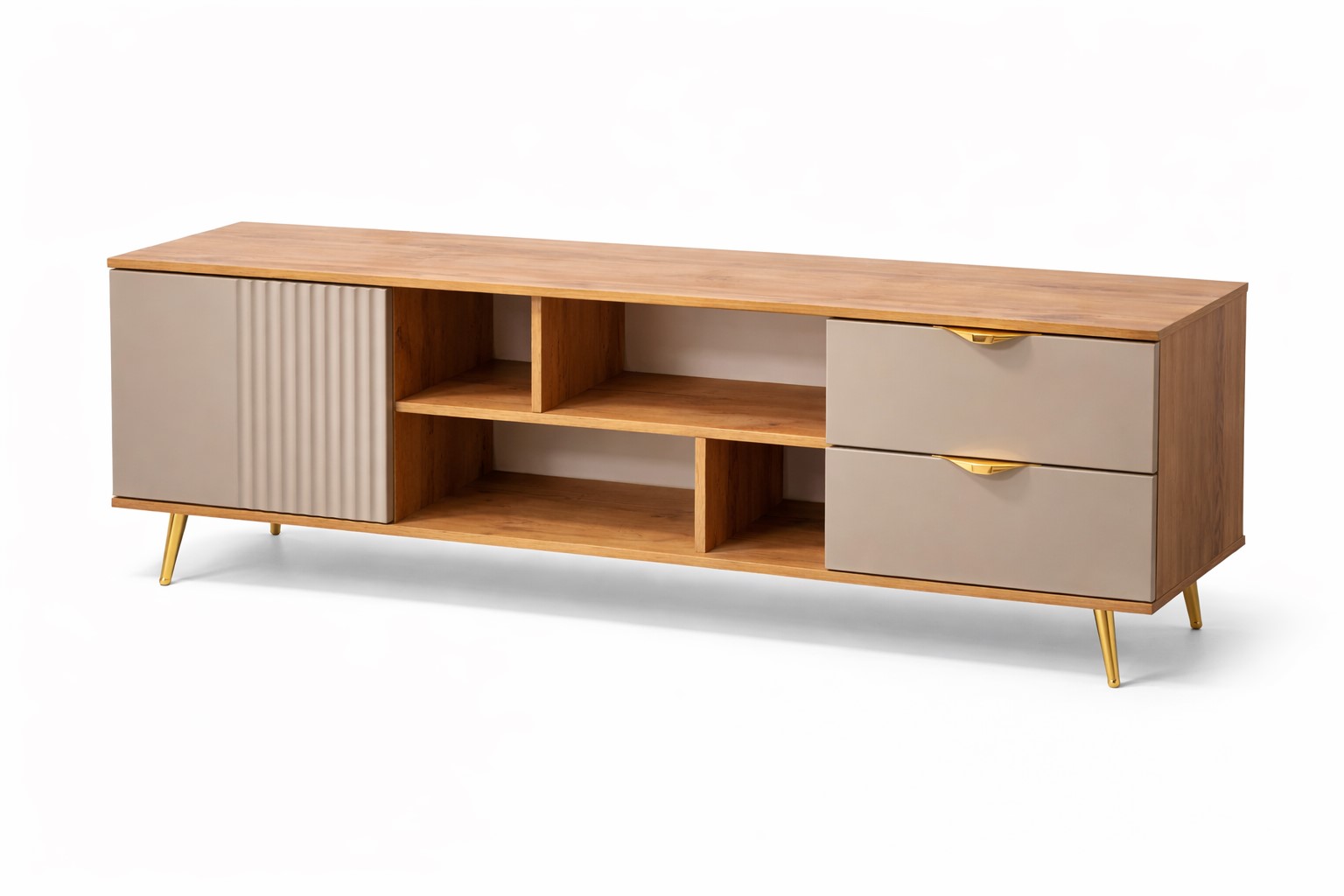 Dekor u tonu Wotan hrasta unosi prirodnu toplinu i autentičan izgled drveta, dok kamen siva boja doprinosi savremenom i urbanom karakteru komode. Ova kombinacija čini je pogodnom za različite stilove uređenja, od minimalističkih do industrijski inspirisanih prostora.