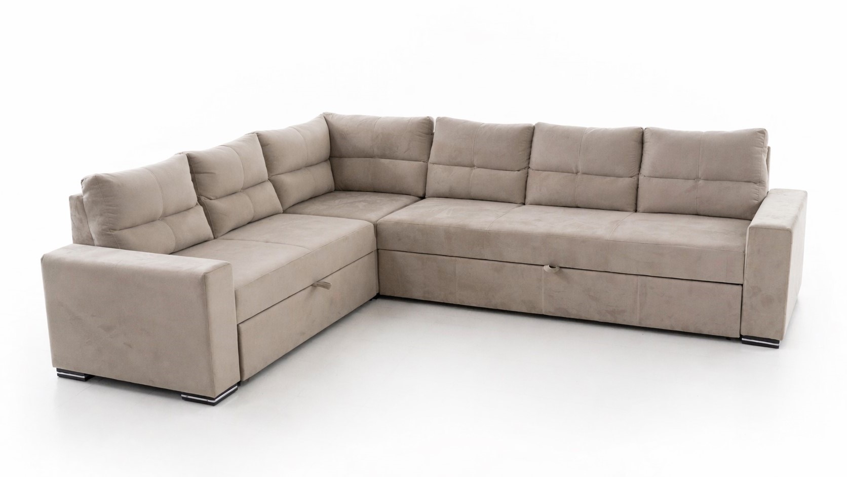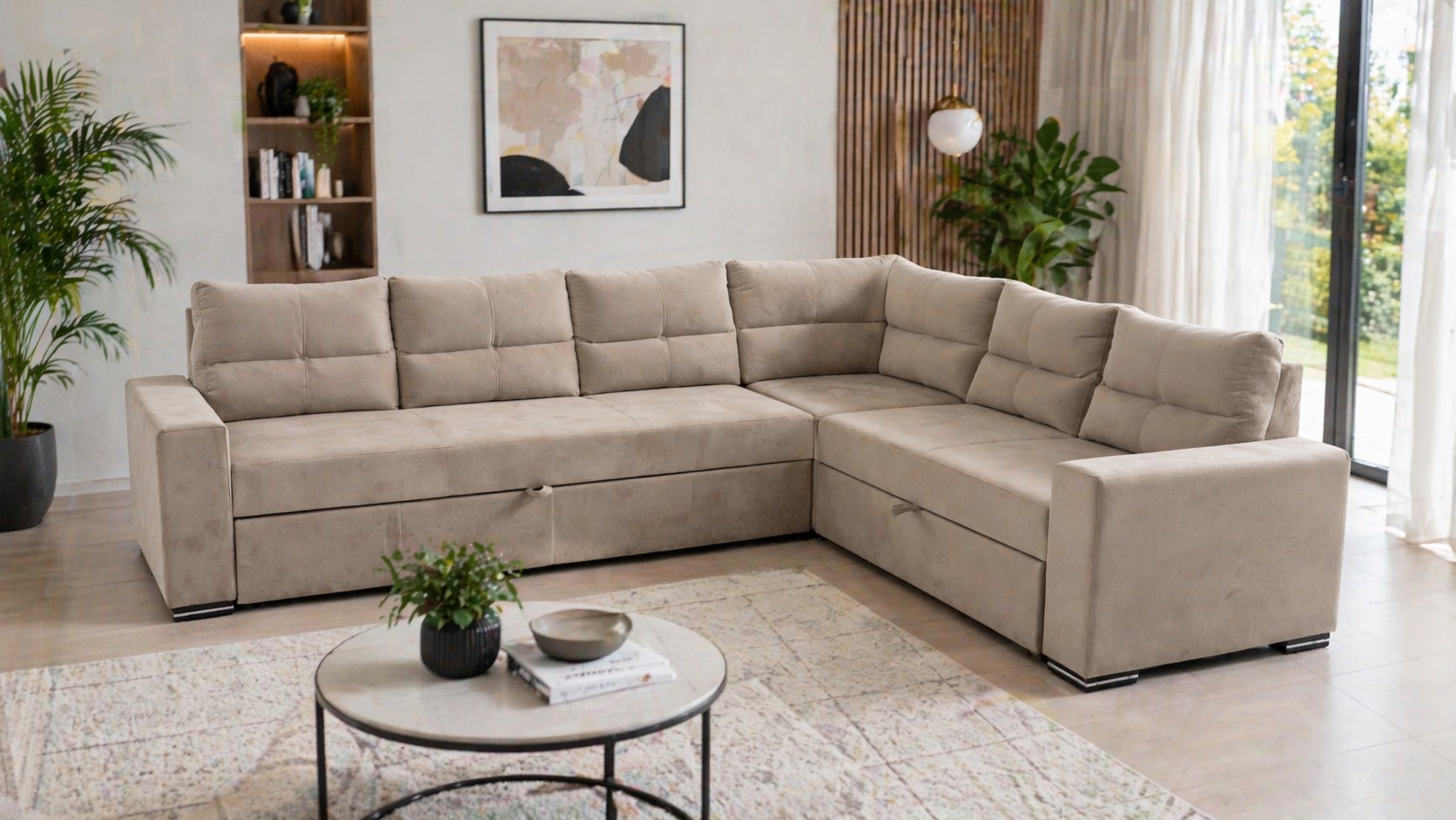 Ugaona garnitura LEONARDO kombinuje moderan dizajn i vrhunsku udobnost. Presvučena mebl štofom u elegantnoj velour 3 bronze nijansi, dimenzija 310 x 245 x 85 cm, idealna je za prostrane i sofisticirane enterijere