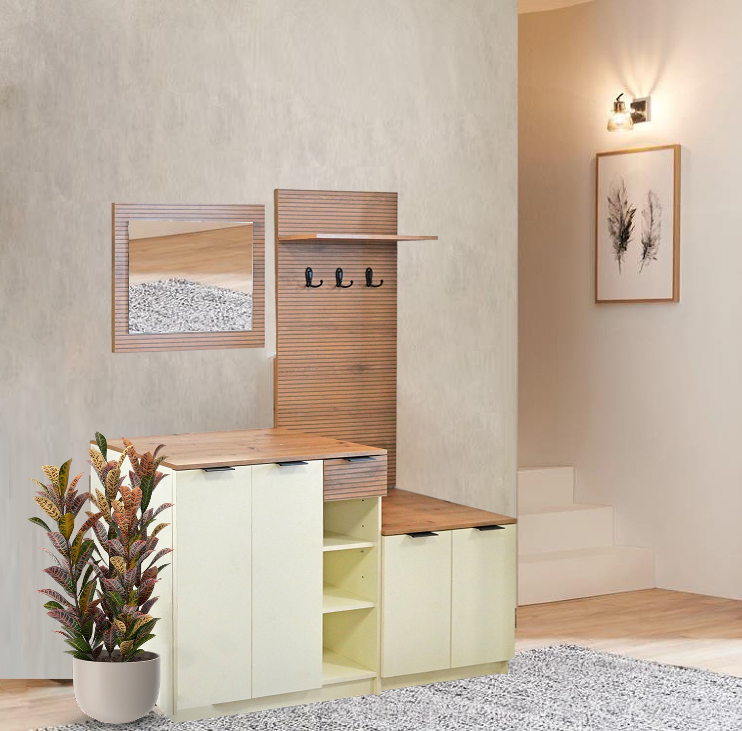 Predsoblje Linea elegantno je i funkcionalno rješenje za uređenje ulaznog prostora vašeg doma. Izrađeno je od kvalitetnog iverala debljine 16 mm što garantuje dugotrajnost i stabilnost. Kombinacija sofisticiranih boja čini ovaj komad namještaja vizuelno privlačnim i lako uklopivim u različite stilove enterijera.