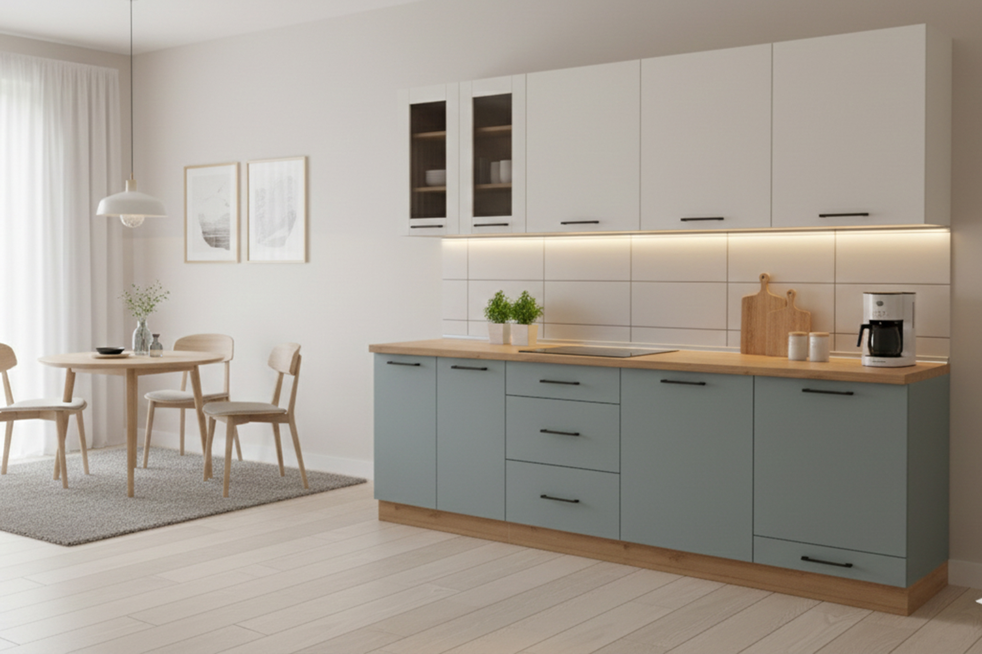 Kuhinja Velina osmišljena je za praktičan i ugodan svakodnevni život. Moderna kombinacija boja Divlji hrast / Alabaster bež / Fjord zelena unosi toplinu i svježinu u prostor, dok jednostavne linije omogućuju lako uklapanje u različite stilove interijera.